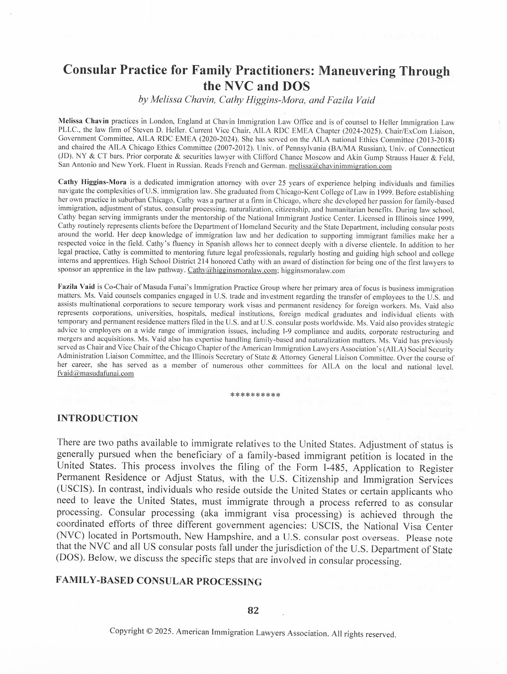 This year, Cathy published her AILA article, Consular Practice for Family Practitioners: Maneuvering Through the NVC and DOS (see attached). She is also currently working on the manuscript for Immigration Law: Chapter 12 – Permanent Residence Under the Diversity Immigrant Visa Program, manuscript alongside various colleagues, for the Illinois Institute for Continuing Legal Education (IICLE). The IICLE dedicates themselves on gathering volunteering lawyers from Illinois to help write manuscripts such as the one Cathy is working on, to publish comprehensive handbooks for Illinois Attorneys.